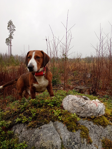 Väinö on kuitenkin ollut tänä viikonloppuna pieni ilonaihe. Lauantai vaikutti alkavan huonosti, kun ensimmäisestä paikasta jouduimme väistämään hirvimiehiä ja toisessakaan ei koira meinannut ensin irrota haulle. En tiedä oliko sillä hyviä hajuja