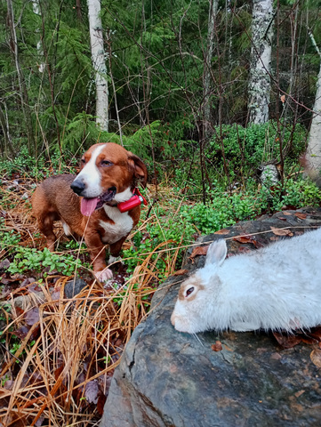 No, ei tuossa vahinkoa tapahtunut, jänis oli pieni ja tuli kohta takaisin, sitten otimme lyhyen suojuoksukisan, jonka päätteeksi Elkku sitten joutui nöyrtymään. Kaiken kaikkiaan mukava päivä, jänis saatiin ja Millikselle kolme hyvää hakua ja ylösottoa. Ainoastaan Milliksen jänissaalis vielä odotuttaa itseään, se harmittaa. Mutta ensi kerralla sitten.